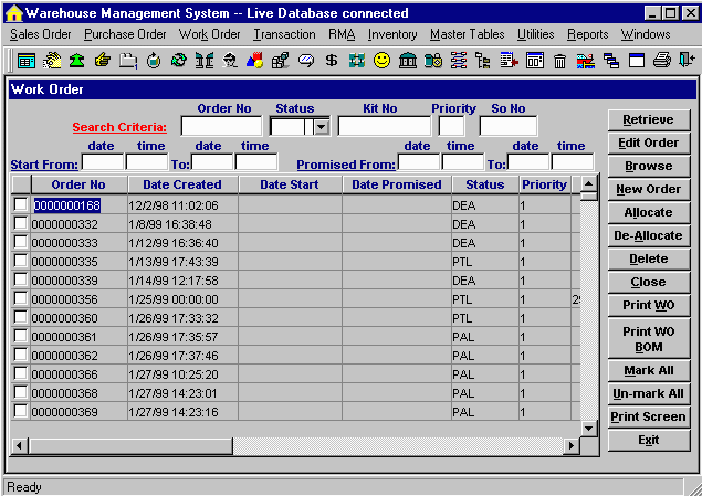Warehouse 2000 Work Order gives you the total avaiability of your open work orders by status. With various search criteria, your planner can easily view material requirements and the cost calculation before releasing the job to production. Detailed work order transactions will be captured such as "time in and time out" of different work centers, operator ID, and scrap tolerance. Specific Lot/Serial number can be allocated per users'demand